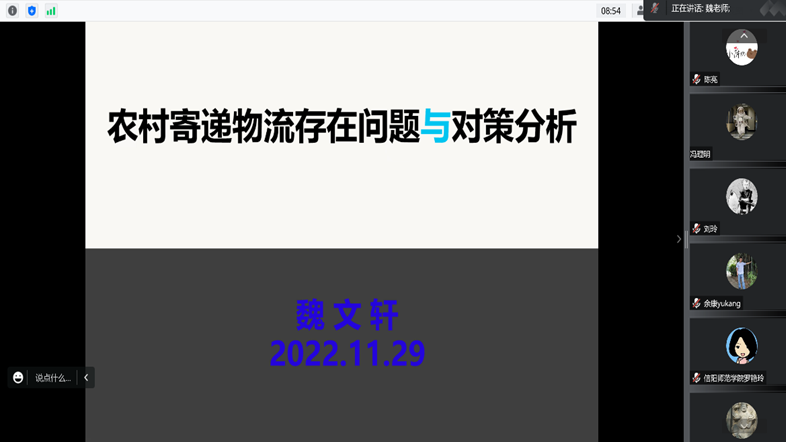 11月29日下午,太阳集团tyc151第五期“景明论坛”在腾讯会议平台成功举办。太阳集团tyc151魏文轩教授作了题为“农村寄递物流存在问题与对策分析”的学术报告,太阳集团tyc151部分师生聆听了报告。