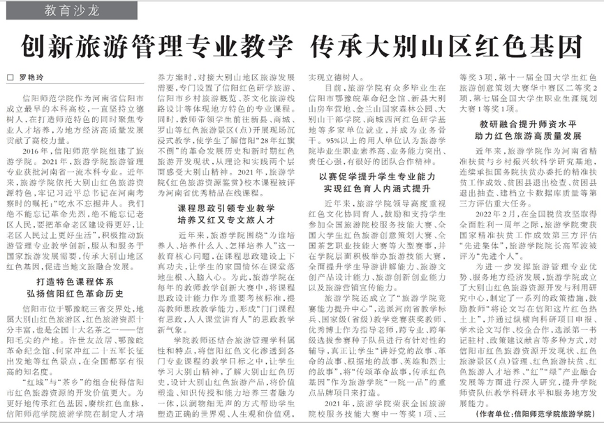 7月4日,《中国旅游报》刊发公司罗艳玲副教授署名文章《创新旅游管理专业教学 传承大别山区红色基因》。该文章从课程体系、课程思政、技能竞赛、教研融合四个方面对公司旅游管理专业人才培养经验进行了系统介绍。