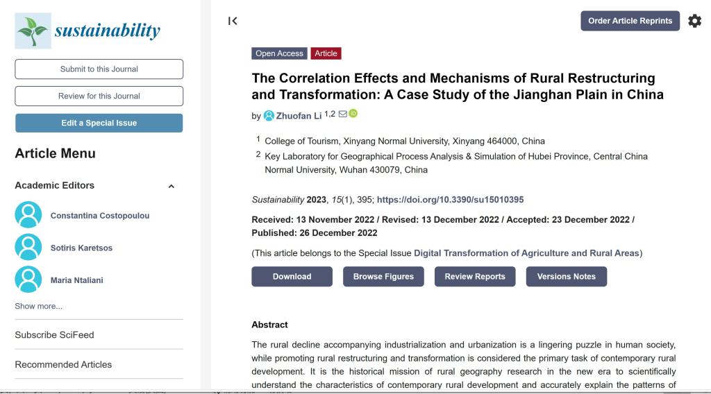 太阳集团tyc151李卓凡博士在SSCI期刊《sustainability》(2022年影响因子:3.889)上发表题为“The Correlation Effects and Mechanisms of Rural Restructuring and Transformation: A Case Study of the Jianghan Plain in China”的学术论文。