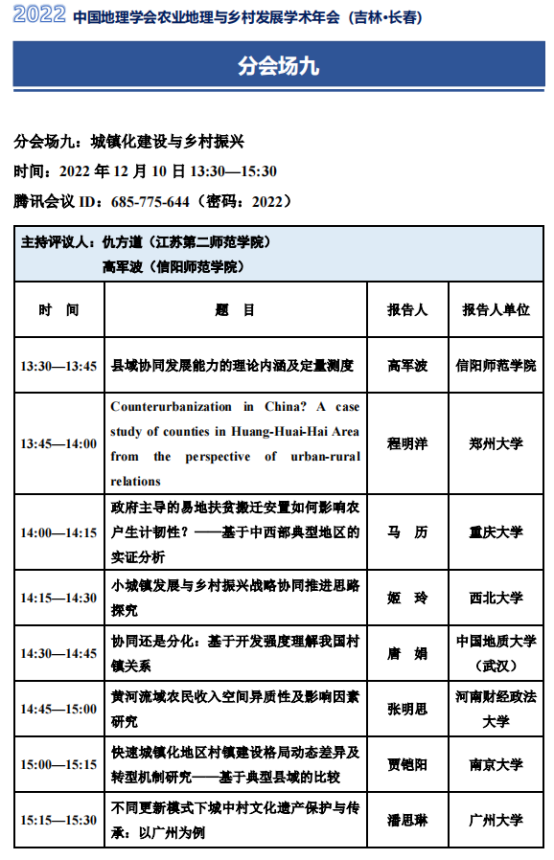 12月10日,由中国地理学会农业地理与乡村发展专业委员会、东北师范大学联合主办的2022中国地理学会农业地理与乡村发展学术年会“人地系统科学与乡村振兴战略”在吉林长春召开,会议以在线形式召开。太阳集团tyc151高军波教授在第九分会场“城镇化建设与乡村振兴”参会,做了题为“县域协同发展能力地域类型与形成机制”报告,并应邀作为会场评议人,对8个报告进行点评。