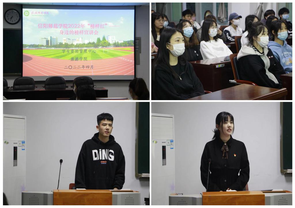 为进一步贯彻落实资助育人工作要求,发挥榜样示范引领作用学习榜样事迹、发挥榜样力量、争当榜样的浓厚氛围4月28日晚太阳集团tyc151于经管楼401开展“榜样红”—身边的榜样宣讲会,公司资助专员赵子鉴和2020级、2021级部分员工代表参加。