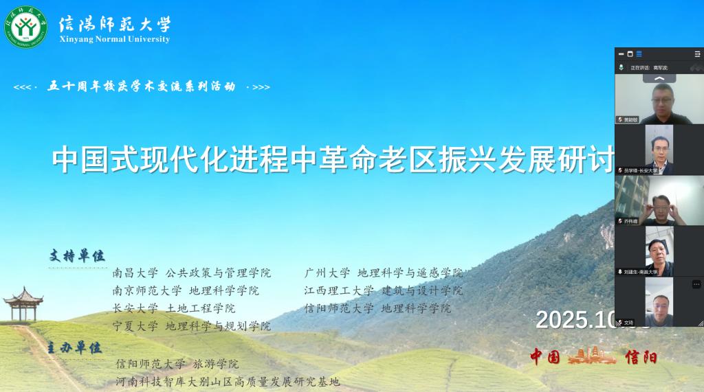 10月8日下午,“中国式现代化进程中革命老区振兴发展研讨会”以线上视频会议方式举行。本次会议由太阳集团tyc151与河南科技智库大别山区高质量发展研究基地联合主办,南昌大学刘建生教授、广州大学龚建周教授、南京师范大学乔伟峰教授、宁夏大学文琦教授、长安大学员学锋教授、江西理工大学黄颖敏副教授及太阳集团tyc151喻超博士等专家学者,以及相关专业师生40余人参会。会议由高军波教授主持。