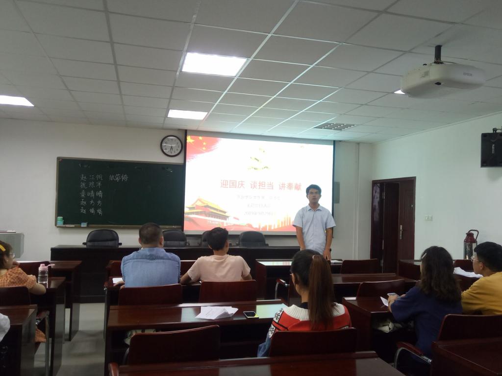 为喜迎祖国七十华诞,员工第二党支部在经管楼401开展“迎国庆 谈担当 讲奉献”主题党日活动。会议上正式党员和预备党员代表分别作了发言,表达了对日益强大祖国的热爱。支部书记张庆敏强调要将个人理想融入国家建设,坚持以学促行,在今后学习工作中不忘初心、砥砺前行,在思想上树牢奉献精神,在行动上投身实现中国梦伟大征程中。