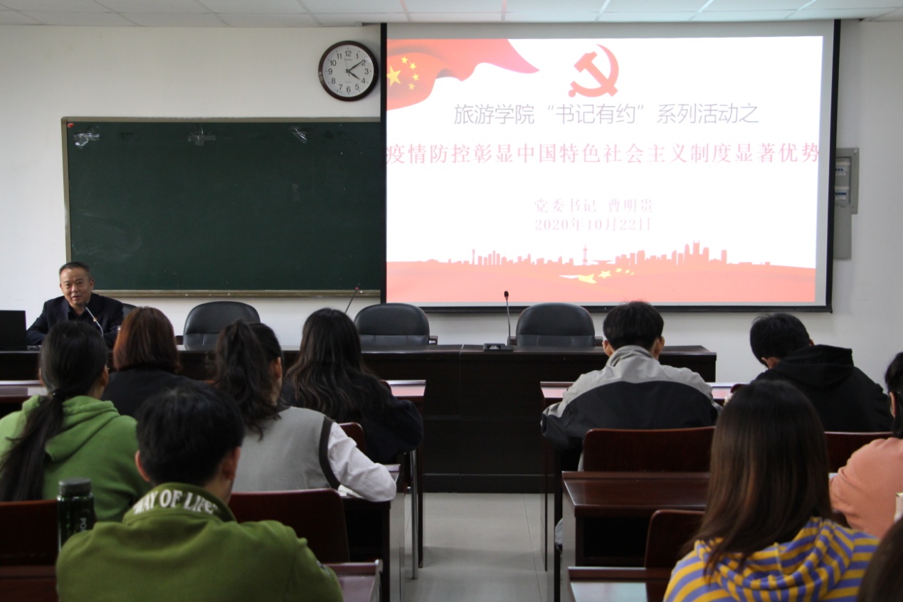 10月22日, 公司党委书记曹明贵在经管楼401会议室以“疫情防控彰显中国特色社会主义制度显著优势”为主题为全体党员上了一堂别开生面的党课。