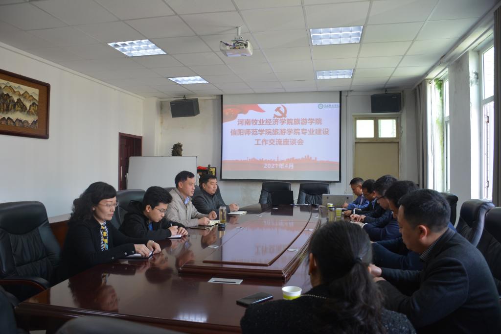 2021年4月11日,河南牧业经济公司旅游公司经理王德静、书记李喜民一行7人,来我校旅游学院进行专业建设调研交流,公司旅游公司经理彭荣胜、副经理郭军升、旅游系系主任吴国琴、酒店系系主任江晓晗一同出席了专业建设交流会。