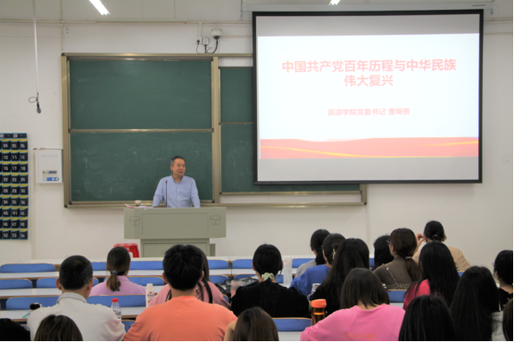 为深入开展党史学习教育,5月13日, 公司党委书记曹明贵在社科楼215以《中国共产党的百年历程与中华民族伟大复兴》为题开展专题党课,2019级旅游管理3班和酒店管理班全体员工参于此次会议。