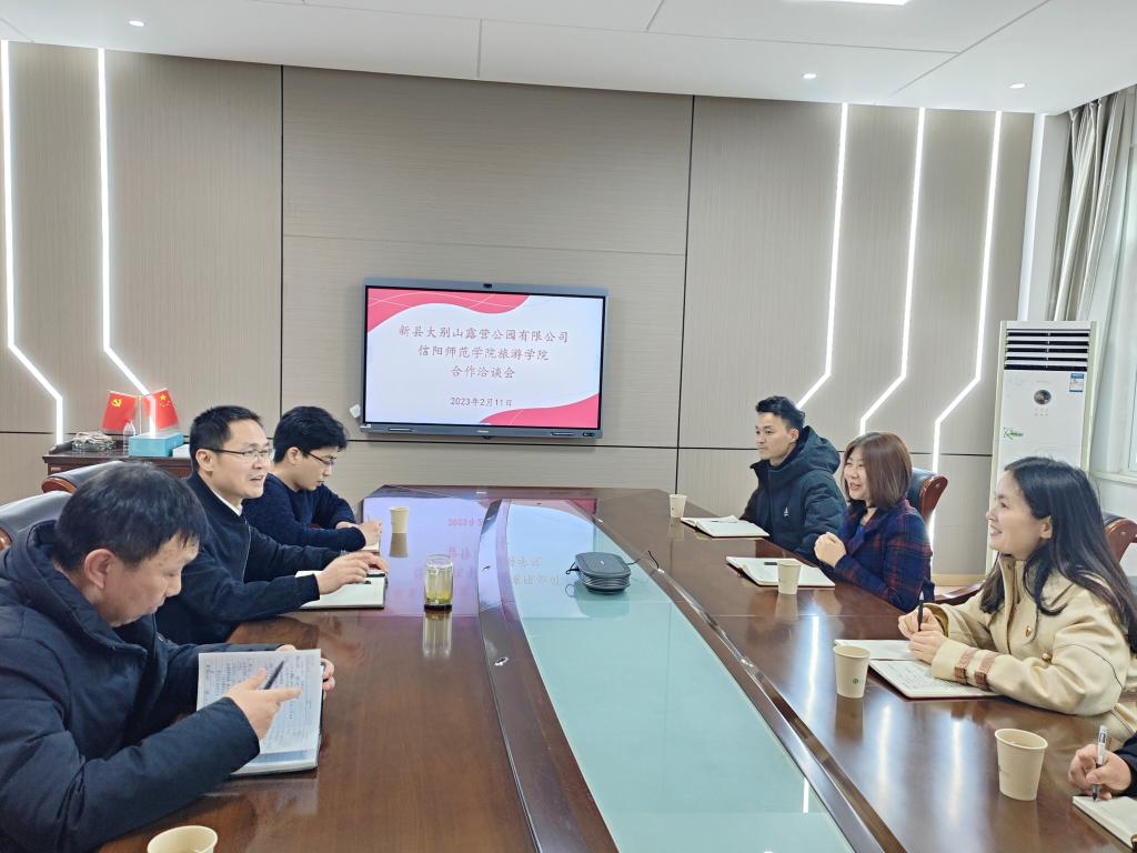 为促进校企合作、产教融合,创新人才培养方式,培养更多的旅游应用型人才。2023年2月11日下午,新县大别山露营公园有限公司董事长殷林一行来公司洽谈推进校地合作事宜,经理高军波、副经理江晓晗以及罗艳玲、李友亮、刘玲等老师参加座谈会。